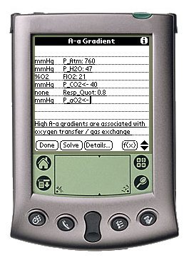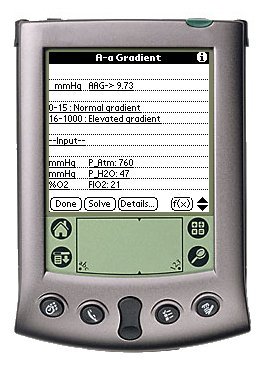 After you have indicated the input area of interest, simply turn your stylus to the Grafitti decimal entry area of your Palm (on the right side of the writing area), and enter the value. You must enter the value in the units specified at the start of the input line. In this case, P_aO2 must be entered in mmHg (the most common unit used for oxygen tension in clinical medicine.)