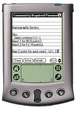 | Many of the criteria have yes / no type responses but the the MedCalc 3000 Palm version can accept only decimal entries. As illustrated, this patient has congestive heart failure, so we entered a "1." Since the patient has no renal disease we entered a 0. You will notice that the parameters are numbered c1, c2, c3, etc . . . This is for internal system use only. This patient is relatively sick with a variety of co-existing medical conditions as indicated. Though we input significant clinical details, there is no mechanism to enter patient identifying information. The MedCalc 3000 system never collects patient identifying information. This is the best way to protect patient privacy.